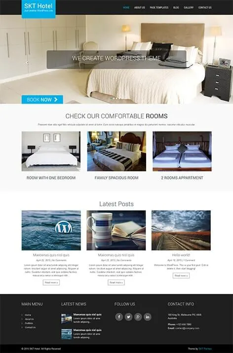 Wide slider which comes default adds to the whole feel of the theme. Free hotel WordPress theme SKT Hotel Lite is a responsive theme and hence looks good on all devices and has been tested on all sorts of browsers as well.